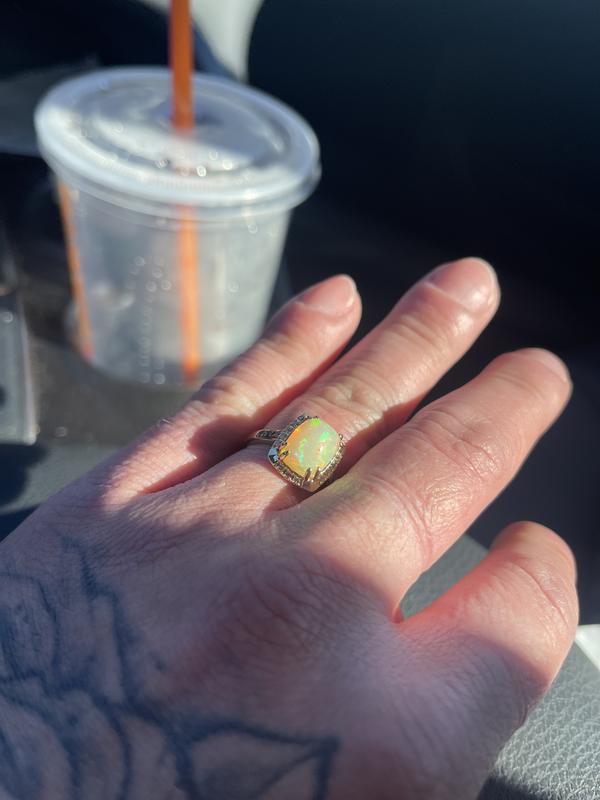 This Levian opal ring is absolutely breathtakingly beautiful. It is gorgeous and the design is spectacular. I bought this ring for my daughter as a graduation present for her getting her master’s degree. I would give this ring TEN stars if I could. Absolutely beautiful! Levian you never disappoint!