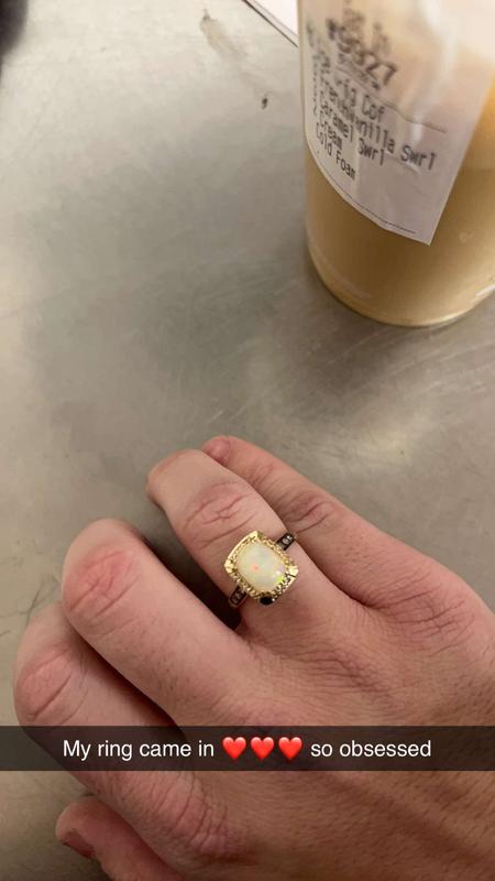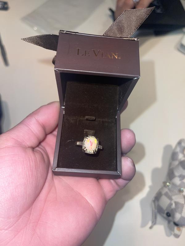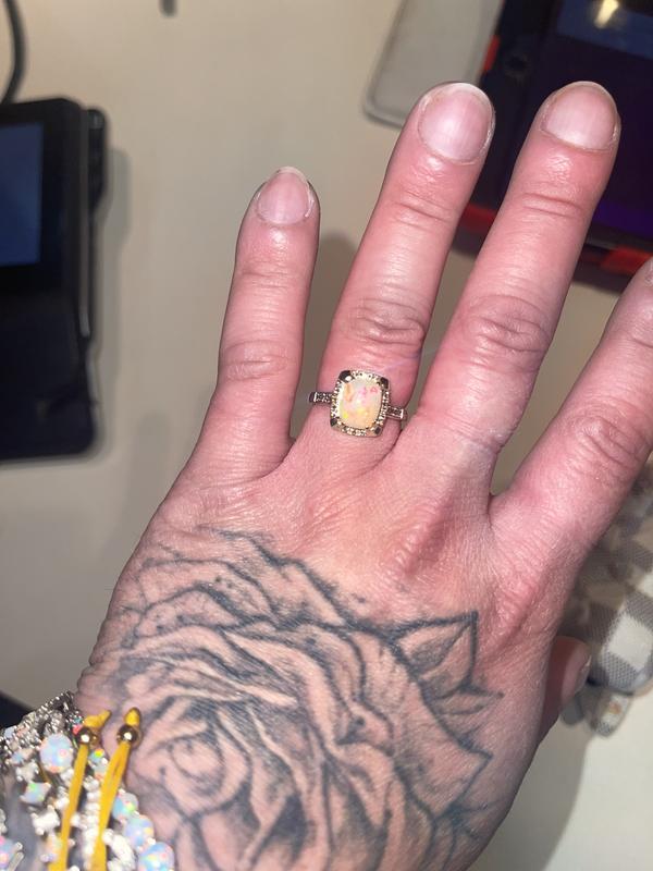This is a very beautiful ring. The Opal has brilliant color and the setting is stunning. Le Vian jeweler doesn’t disappoint