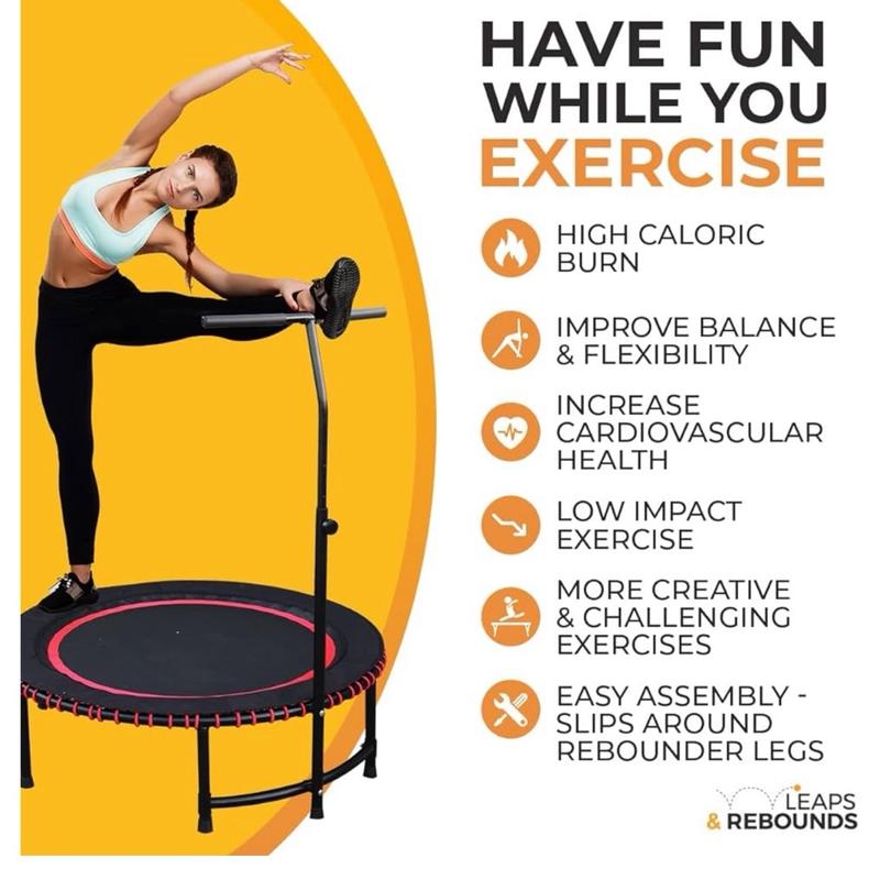 The Leap & rebound adjustable stabilizer bar for fitness trampolines is great for making the fitness trampoline experience more safe and easy.