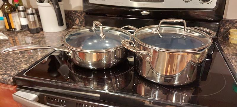 Thanks to a thick, aluminum core, these versatile pans are fast-heating and boast an even cooking surface. The exclusive, over-sized stay cool handles are designed for easy maneuvering with oven mitts and the drip-less pouring rims help prevent kitchen spills. This is a healthy and eco friendly alternative to conventional PTFE nonstick coatings. This innovative PFOA and PTFE free ceramic coating does not release fumes into the environment when heated.